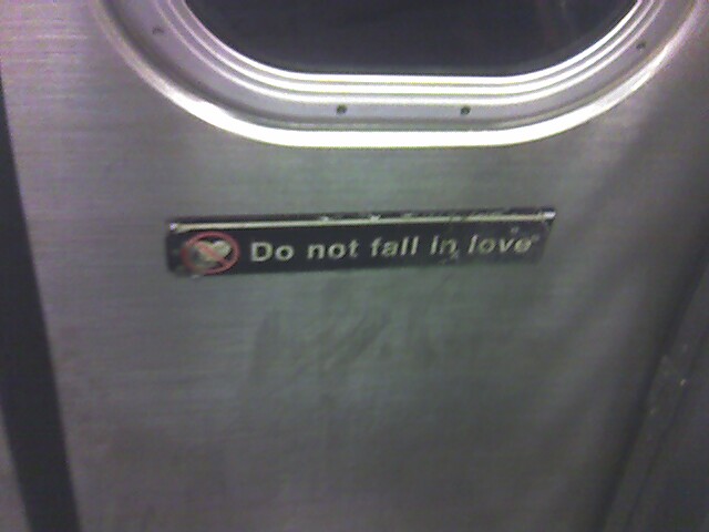 “Do not lean on doors” replaced with “Do not fall in love”.