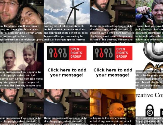 The Open Rights Group is collecting "Messages to Mandelson" — that is, photos and brief textual messages to UK Business Secretary Peter Mandelson, who has proposed that you should lose your access to the Internet if anyone in your household is accused (without proof) of violating copyright law. You can upload your photo and message and let Mandelson know how you feel.