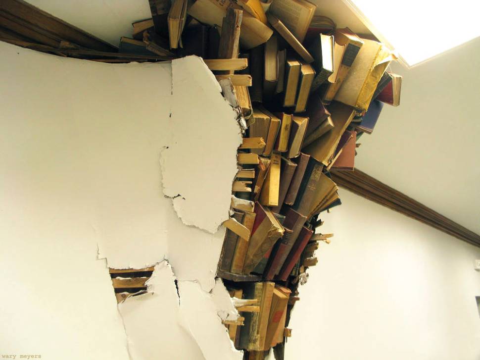 Warey Myers designed this installation for the new offices of Portland's VIA Advertising Agency, which are in the Baxter Building, home to the Portland Public Library from 1888-1960: "Books breaking through the (faux) wall downstairs, referencing the "basement stacks" every library has. In this case it's as if those stacks had been sealed up during some remodel, and are anthropomorphically breaking through, referencing the old library, history, roots, poltergeists…"
