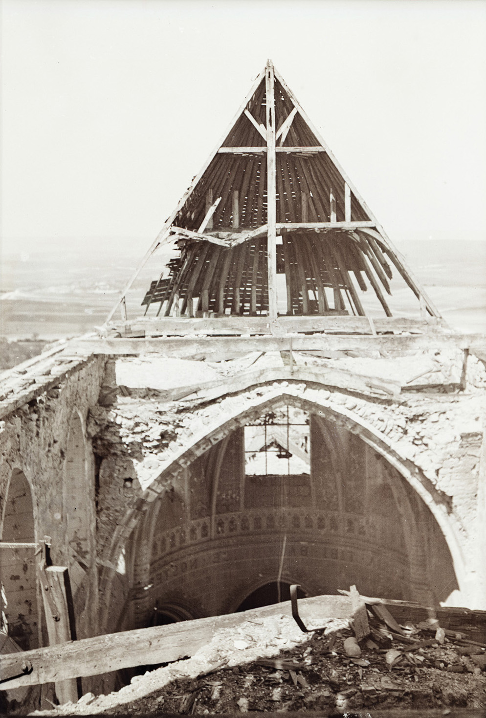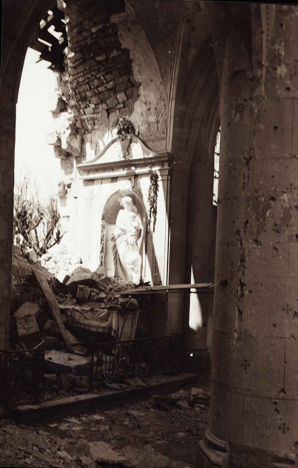Walter's training as an architect drew him to photograph and sketch many buildings throughout the war. Churches were a particular favorite, and with their roofs blown off by battle these were probably rare opportunities to capture their insides on the insensitive film of the time.