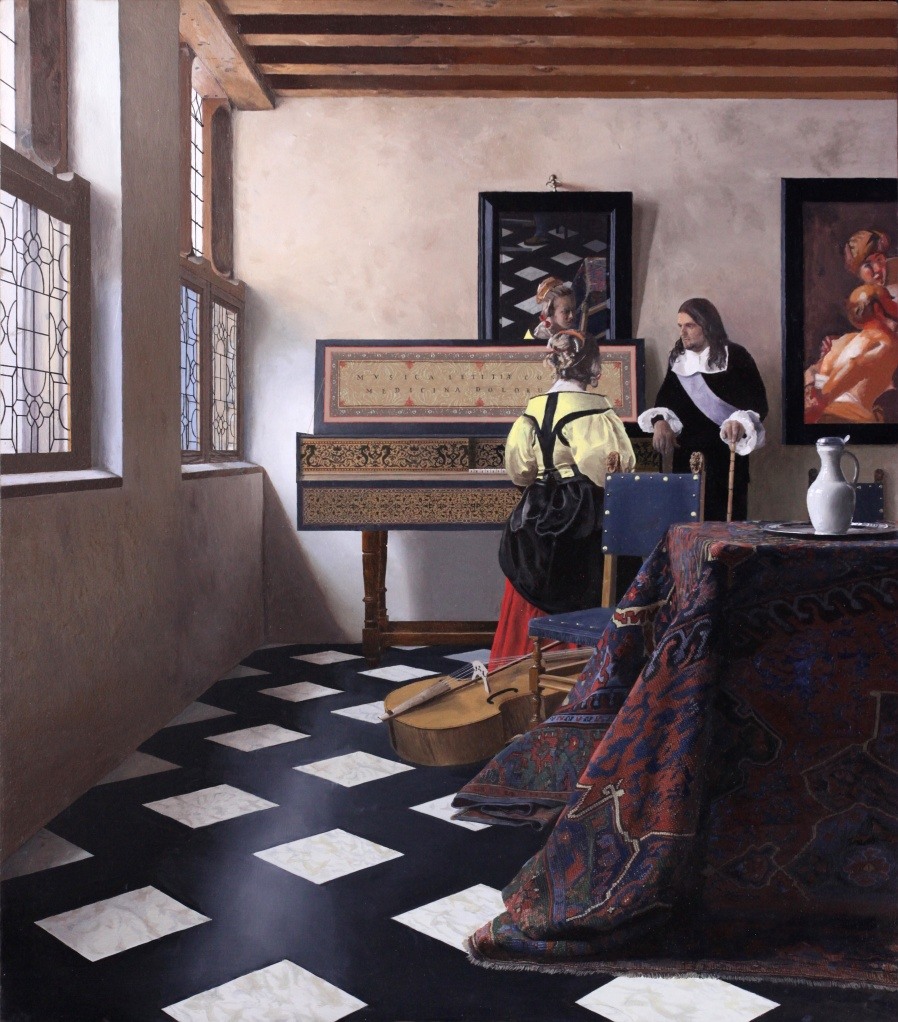 That's where things got a little out of control. The simple-sounding experiment took years to complete. I decided that to really test the theory, I would have to make a little time machine. I would build an exact full-scale model of the room Vermeer painted in The Music Lesson, and then sit in the room with my optical device and paint, using natural light and only materials available to Vermeer in the 17th century. I reasoned that if I, a non-painter, could paint something resembling a Vermeer, my theory might hold water.