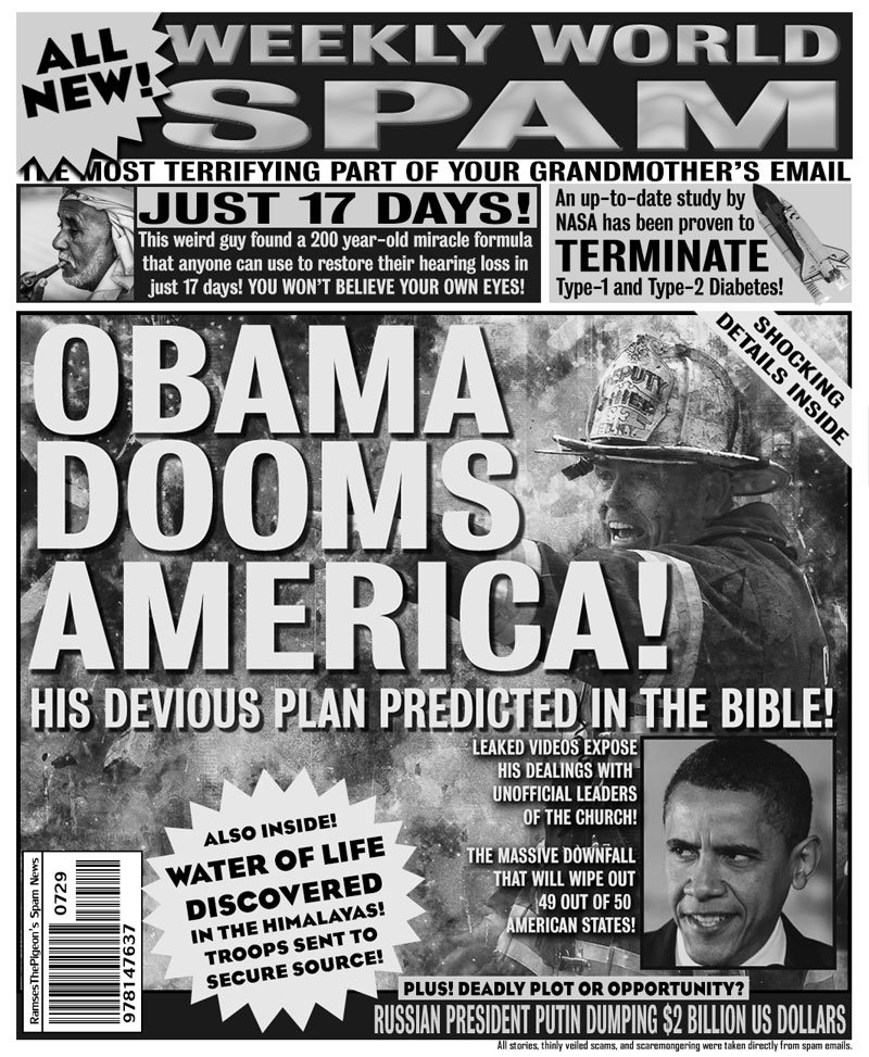 Here's a gallery of fake tabloid covers in the vein of Weekly World News that use actual email spam headlines as coverlines. If this was a real newspaper, I'd buy it!