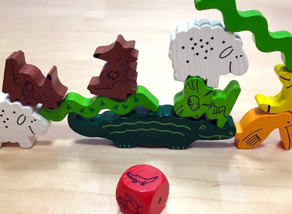 It's not quite as simple as just stacking. The die faces range from widening the base that starts with the big green alligator, to handing off pieces to other people who then have to stack them. Another face has players telling you which piece you'll have to place on the remarkably unstable pile of animals growing in the middle of your table. The other faces are numbers of pieces that you can place. If you topple the tower, you have to take at most 2 of the pieces. First player to exhaust their set of animals wins.