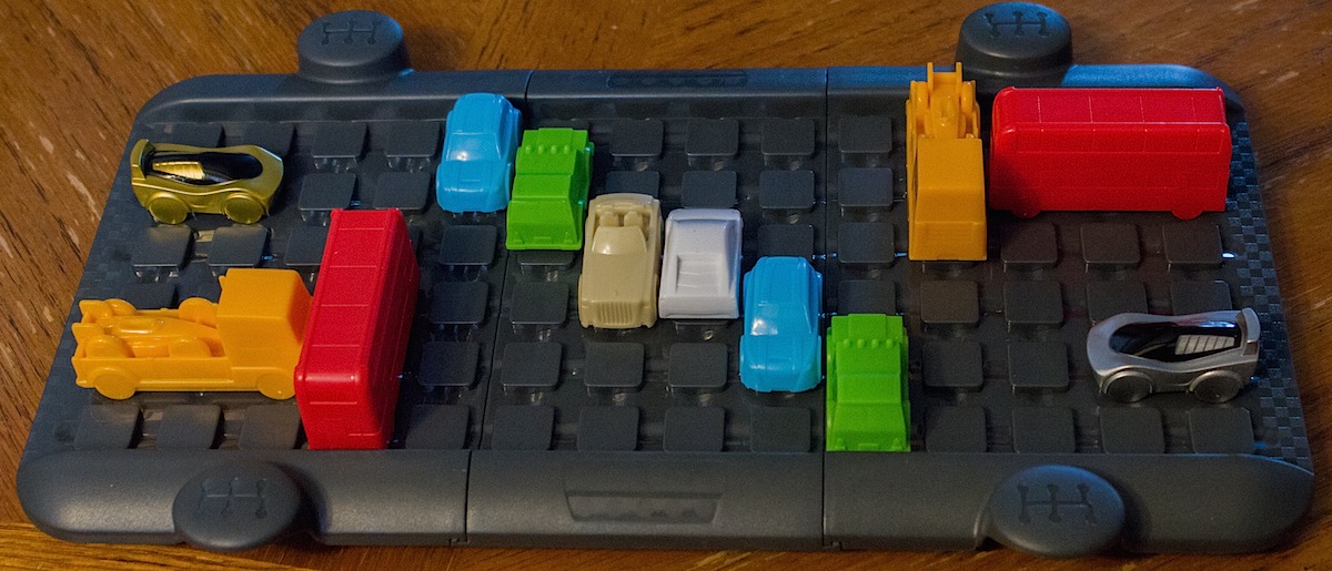 Rush Hour Shift is an entertaining twist on the classic get-the-car-unstuck logic game. Instead of a single player working through pre-designed puzzles, now there are two players working against each other in a constantly changing landscape. The manual includes instructions for ten basic board set-ups to start. Following these instructions, players are positioned at opposite ends of the board while cars of different sizes and colors are placed between them. The object of the game is to get your car (Silver versus Gold) to the other side of the board.