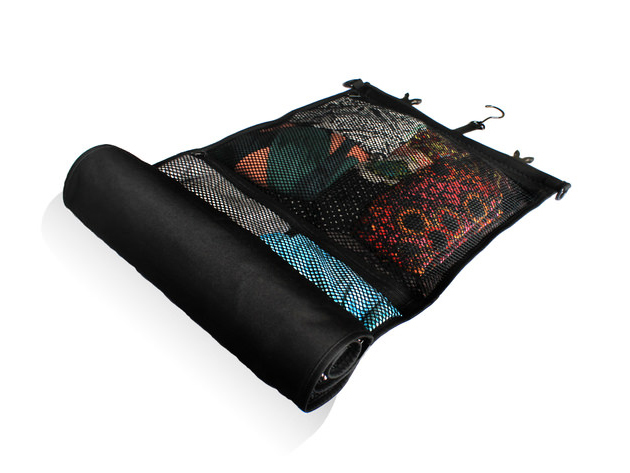 Everything you need fits right in here, categorized neatly among its mesh pockets and handy zippered areas. Simply untie, unfurl and hang it up anywhere to have your personal closet right there in your hotel room. All your clothes and knick nacks are right at eye level so you don't have to scrounge around. It even acts as a portable wardrobe with the included hanger, so your shirts won't get wrinkled. It's just as easy on the going as the coming, because all you do is unhook again, roll up and roll out.