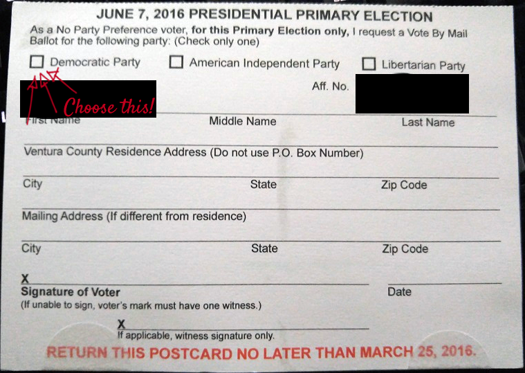 If you are a permanent vote-by-mail (absentee) voter, you should soon be receiving a postcard to verify the ballot you wish to use for voting. Choose 'Democratic Party' if you want to vote for Bernie.