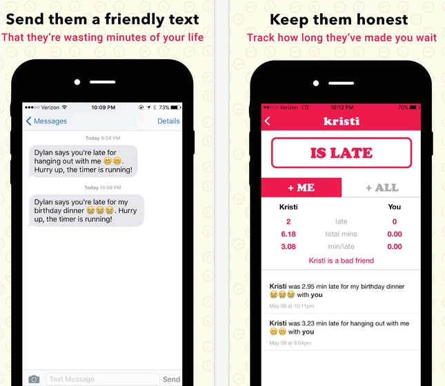 This app, called "late!" tracks the total number of minutes that your friends have kept you waiting. It also sends texts to your friends who are late for an event. "Kristi is a bad friend."