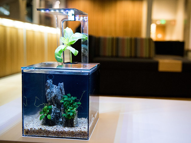 The EcoQube C Aquarium never requires you to change the filter, and it uses 50% less energy and 90% less water than comparable aquariums by using plants like basil or mint to clean. This is big, for your potential future fish friends.