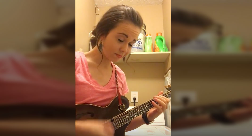 Singer Sierra Hull performs mandolin, backed by her washing machine: "how to practice your bluegrass chops while doing the laundry."