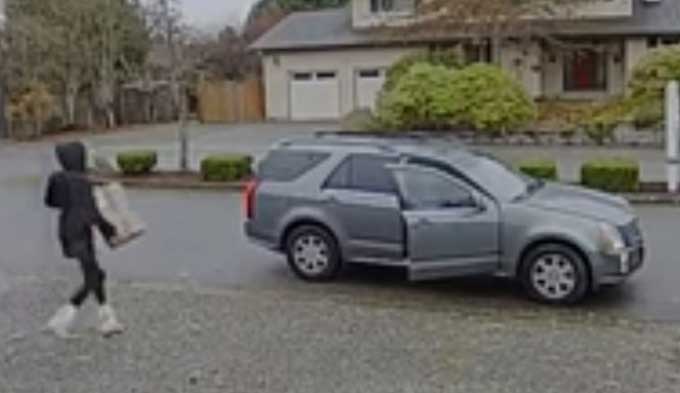 In this security cam footage, we see a car pull up to a driveway. A female passenger gets out, walks up the driveway, and takes a package from the doorstep of the house. She runs back to the car, which still has the passenger door open for a quick getaway. When the thief gets in the car, the homeowner runs out and starts yelling. In a panic, the driver speeds off before the thief is fully in the car, so she falls in the street. (The stolen package is in the car) The homeowner runs over and grabs her. The thief screams to be let go, professing her innocence. The homeowner tells the thief that the crime was captured on camera, which does little to quiet the thief. The video ends before the police arrive but according to the YouTube description, they arrived and arrested the thief after 10 minutes. T