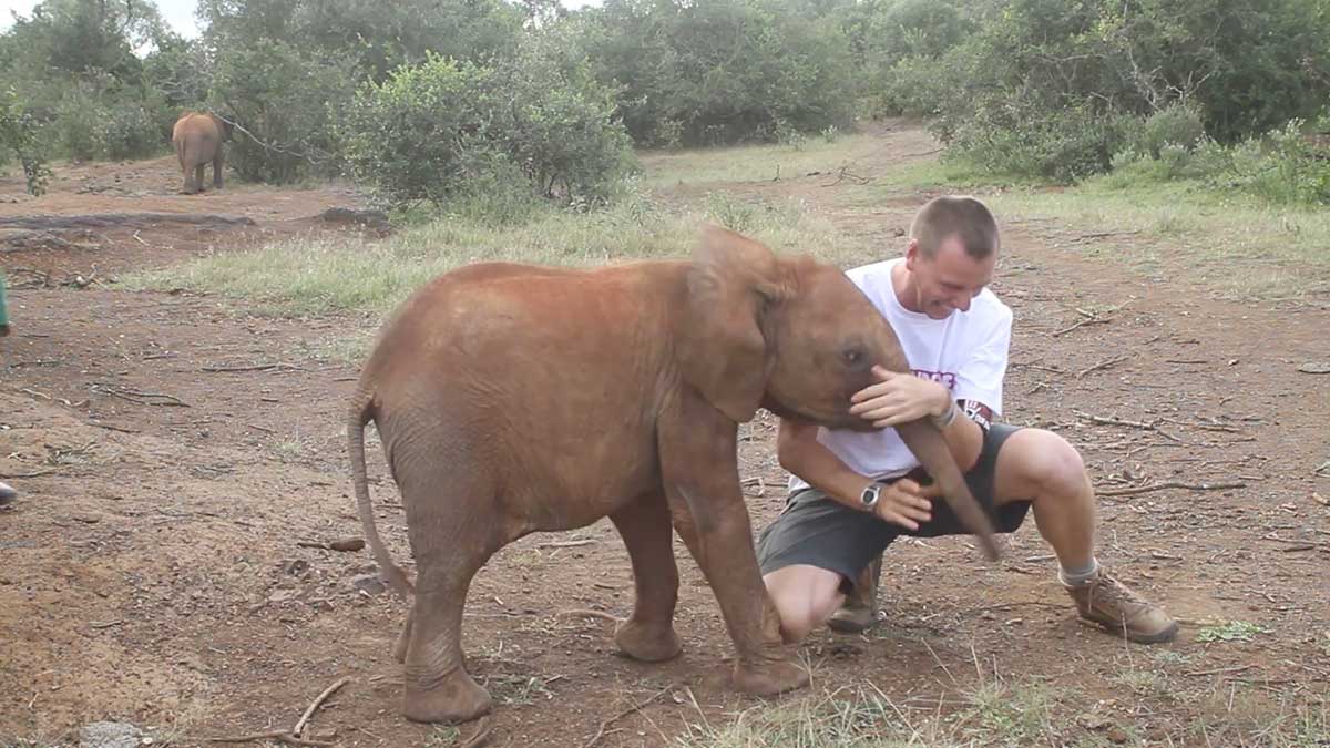 A man has an important message about elephant poaching but this baby elephant won't let him deliver it because it's playtime.