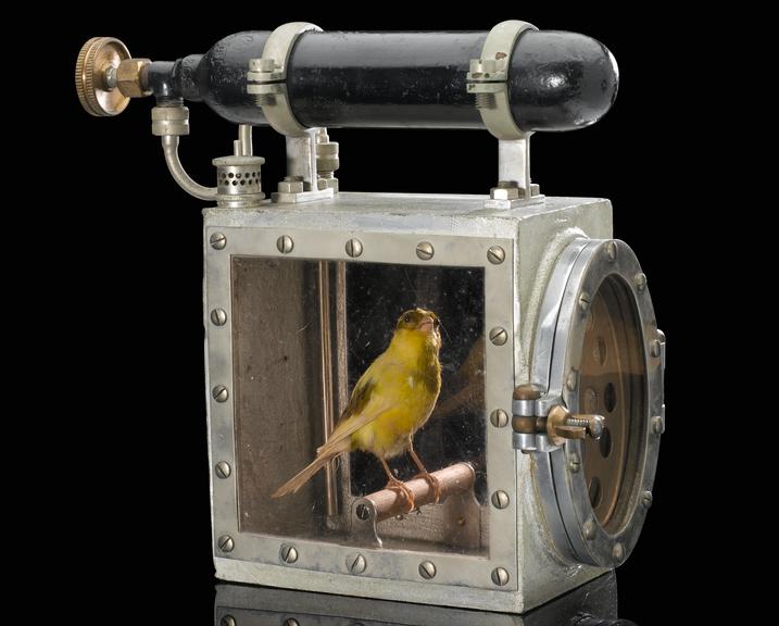 This Canary Resuscitator was manufactured in the 1920s by Siebe Gorman and Co.; it was carried by miners to revive the canaries that were used from the late 19th century until 1987(!) as early-warning signals for potentially lethal gas leaks.