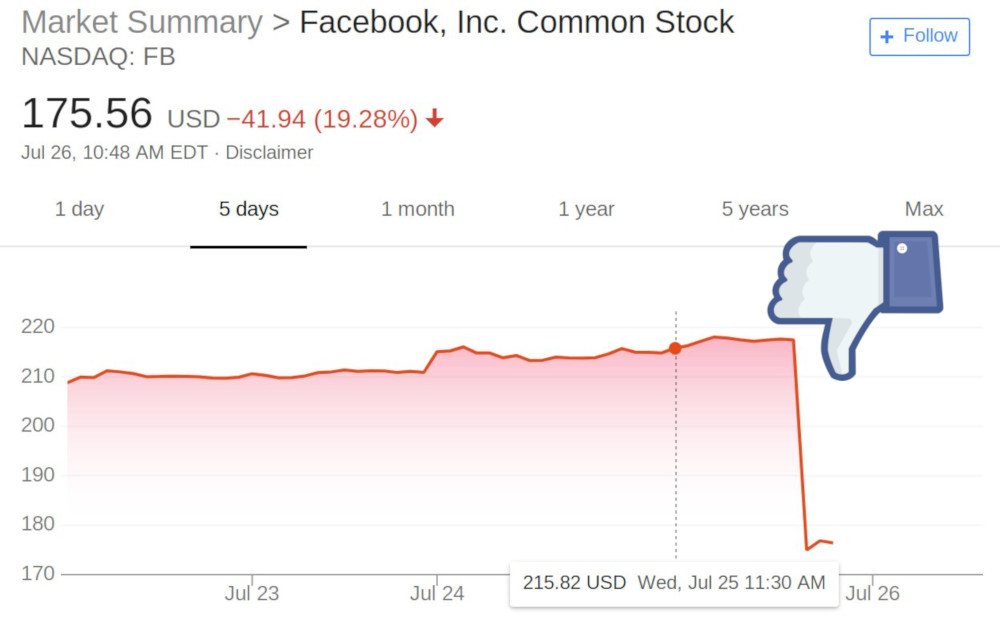 Analysts predicted that Facebook would average 1.48B daily users, but their latest quarterly figures showed only 1.47B dailies; their projected earnings were $1.33B, but they only turned in $1.32B, and they were expected to earn $5.97/user but only earned $5.95/user — and so their shares dropped 24% (they're slightly up from that, but still down 20%).