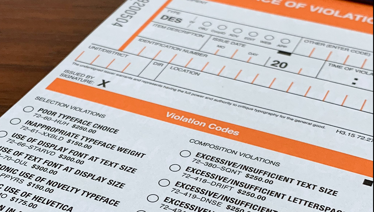 The delights don't stop there. Individual citation codes run the gamut from dad-jokey ("poor typeface choice: 72-60-HUH") to so-inside-baseball-it-hurts ("improper hyphenation/justification: 72-436-RVR"), with a few dashes of guffaw-inducing surrealism thrown in for kicks ("improper word spacing: 72-428-C/WLKN"… get it?). The ticket book includes 32 "common design infractions," which Hoefler admits he had to edit down. "Space permitting, [it] could probably have run to at least 60," he says.