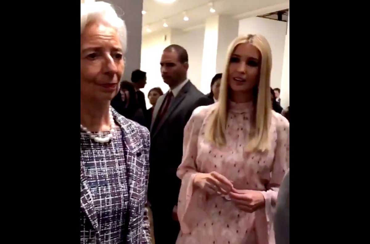 Ivanka Trump appears to be trying to get involved in a talk among Macron, May, Trudeau and Lagarde (IMF head).