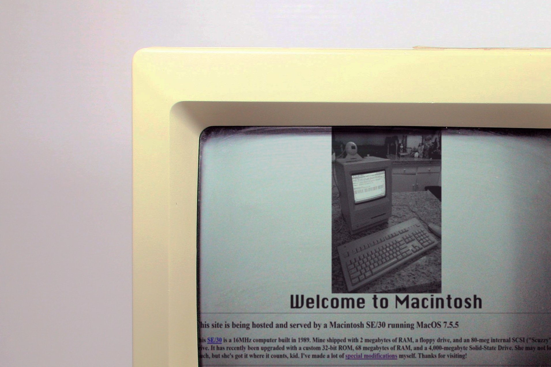 This site is being hosted and served by a Macintosh SE/30 running MacOS 7.5.5. This SE/30 is a 16MHz computer built in 1989. Mine shipped with 2 megabytes of RAM, a floppy drive, and an 80-meg internal SCSI ("Scuzzy") hard drive. It has recently been upgraded with a custom 32-bit ROM, 68 megabytes of RAM, and a 4,000-megabyte Solid-State Drive. She may not look like much, but she's got it where it counts, kid. I've made a lot of special modifications myself. Thanks for visiting!