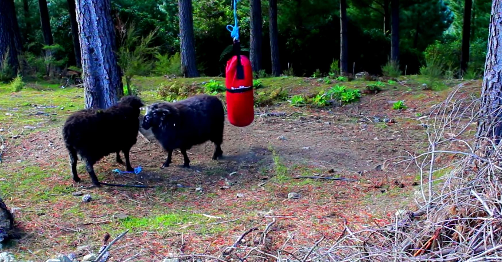 In this video, a pair of rams chance across a boxing bag left dangling from a branch in the woods. Battle commences. A day later, they are ultimately victorious.