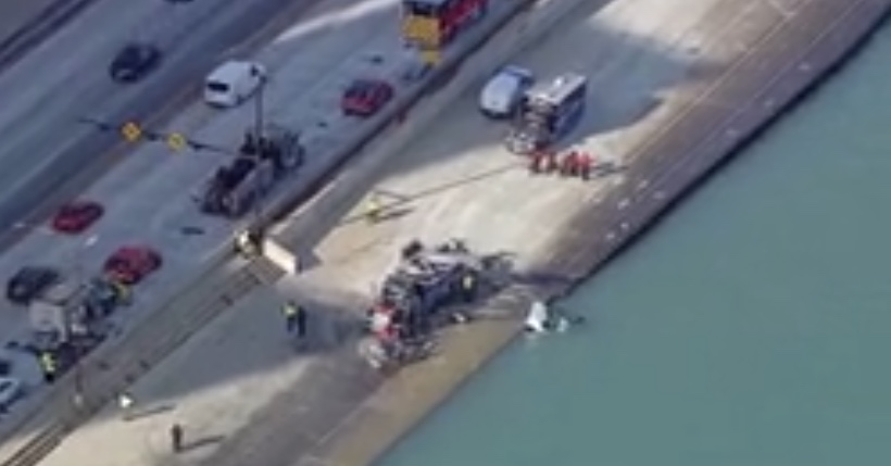 The pickup truck hit a slick spot and slipped backward into the water on Chicago's near North Side around 7:20 a.m., said Dep. District Chief Jason Lach of the Chicago Fire Department Marine Dive Operations. It slid halfway into the water before getting caught on a breakwall.