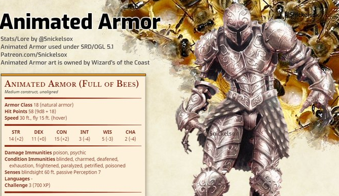 Hello, here is a sheet of Animated Armor that is full of bees. Please feel free to share this around and use it in your game. It is dumb, but I will not apologize. #DnD #Bees #5E pic.twitter.com/4qicec0Wop