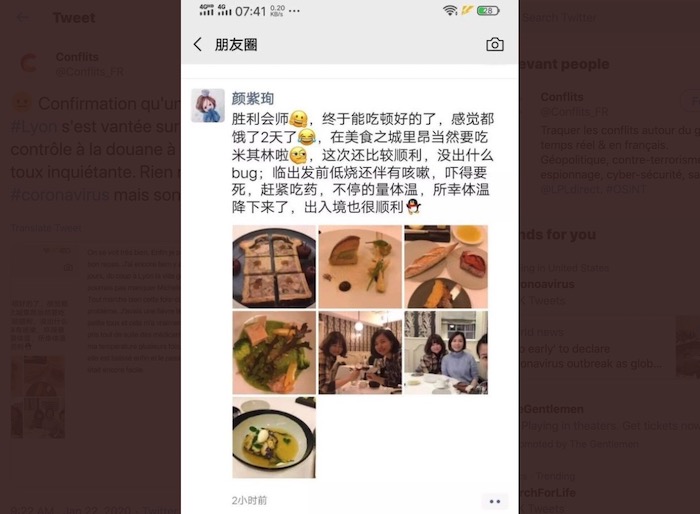 ? Confirmation qu'une Chinoise de #Wuhan arrivée à #Lyon s'est vantée sur WeChat d'avoir réussi à éviter le contrôle à la douane à l'aéroport malgré sa fièvre et sa toux inquiétante. Rien ne prouve qu'elle est infectée par le #coronavirus mais son attitude est irresponsable. pic.twitter.com/nxIrL9ds1u