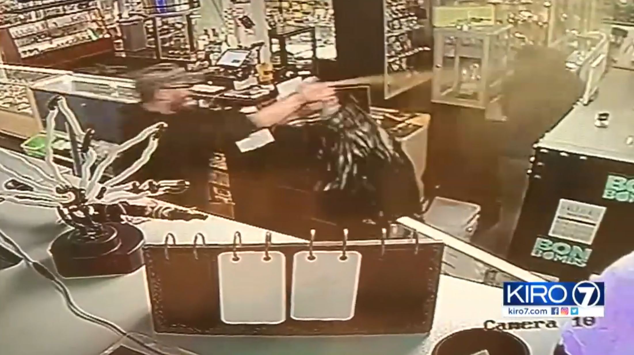 In this security footage, three masked and armed robbers raid a pot shop in Everett, Washington, only to be confronted by an unexpected challenge: a blast of bear spray right to the face.
