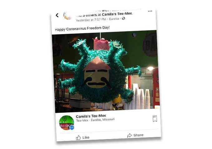 Camila's Tex-Mex, near St Louis, Missouri, installed a piñata in the shape of the Covid-19 virus with a caricaturized face of a Chinese man on it, reports The Riverfront Times. The backlash was swift and severe, and the restaurant took down its Facebook page in shame, but not before trying to pass off the caricature as being Hispanic: