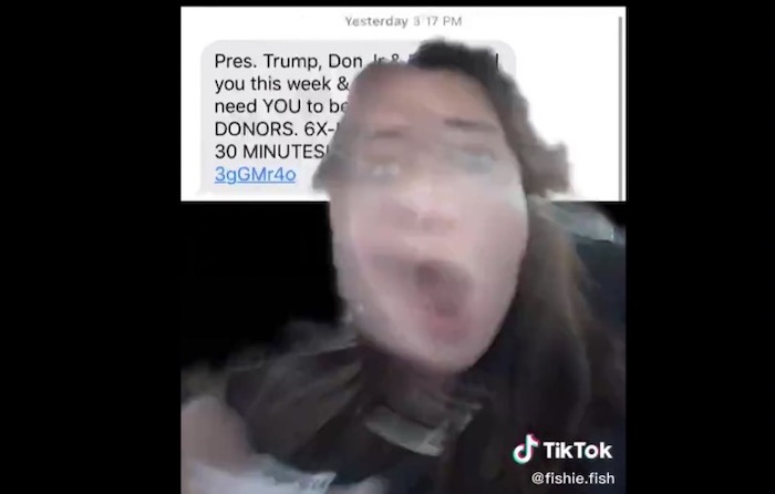 This woman says that when she reserved tickets for Trump's rally she also signed up to receive text messages from the Trump re-election campaign. In this video, she does dramatic readings of the messages, and I laughed out loud.
