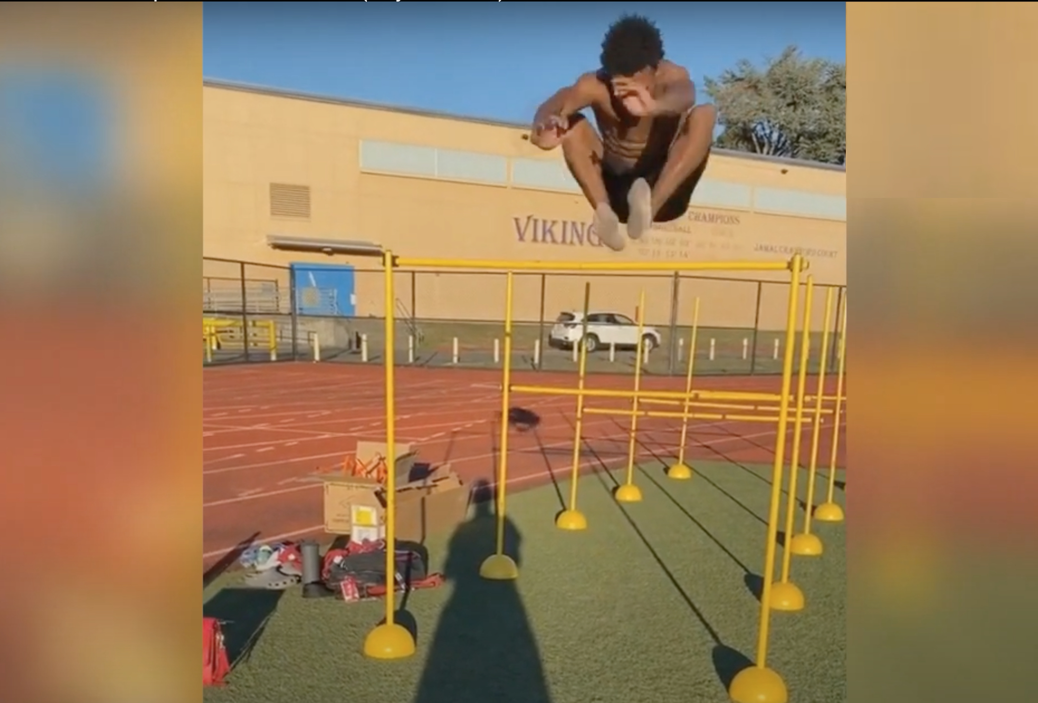 Ray Wells, Jr. seems to defy gravity as he clears five hurdles, the last of which is 155 cm. That is a lot of fast-twitch muscle fiber, and about three times the average vertical leap of someone his age.