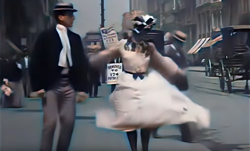 Fifty-four years before Marilyn Monroe starred in The Seven Year Itch, the same scene of a white dress being blown by an updraft from a sidewalk vent was shown to theater patrons. The 1901 movie was called What Happened on Twenty-third Street, New York City, and it was all of 77 seconds long. The film was presented as a slice of life, but it was scripted, and starred Florence Georgie and A.C. Abadie. The surviving print was in pretty bad condition. This copy has been restored and modernized by artificial intelligence.