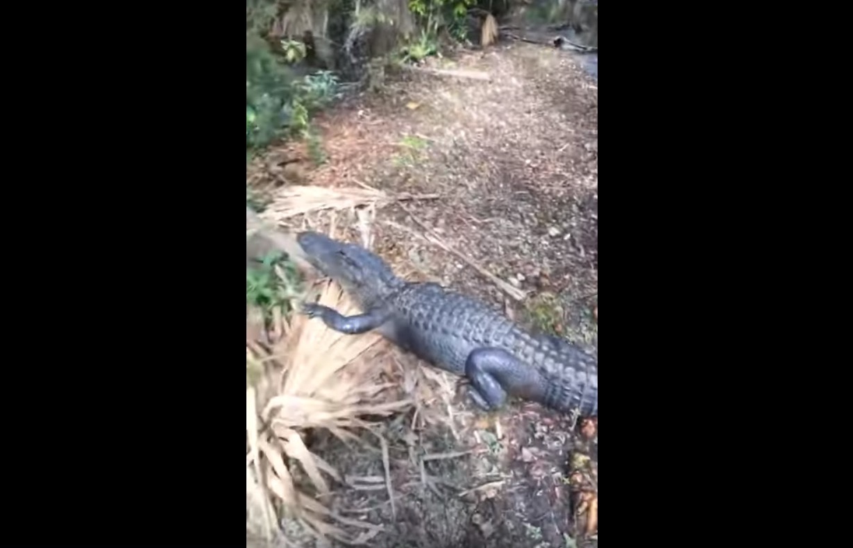 A man hiking in the Everglades was blocked by two alligators on his way back to his car. One courteously got out of the way, but the other wasn't as considerate. At first he tried to talk some sense into it, repeating "Get! Get!" and "Get out of the way!" But when the hardheaded reptile dug in its heels, the man was left with no choice but to go around it by leaping over its tail and making a run for it.