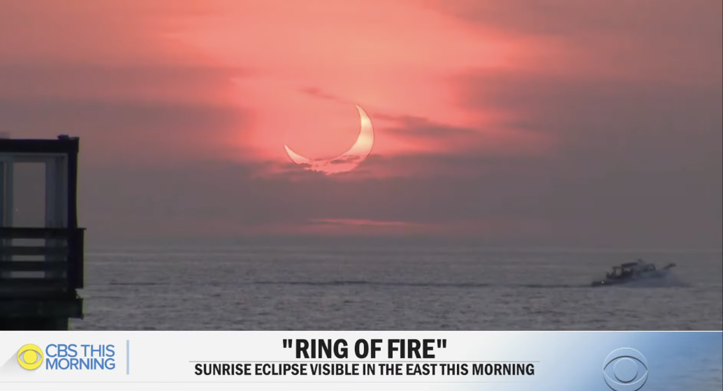 There are stunning pictures and video of the morning solar eclipse that took place in the northern hemisphere Thursday. Unfortunately, for most Americans the "ring of fire" effect, when the moon blocks the sun but for an outer illuminated ring, was only visible in Ontario, Canada. The large moon bites taken out of the sun in the morning sunrise is still remarkable enough to appreciate and some shots look like good sci-fi art.