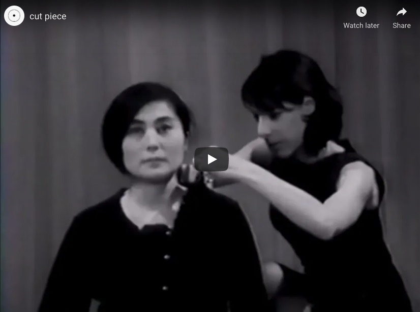 In Cut Piece (1964), one of Yoko Ono's early performances, she sits alone on a stage with a stoic expression on her face. There is a pair of scissors lying in front of her.