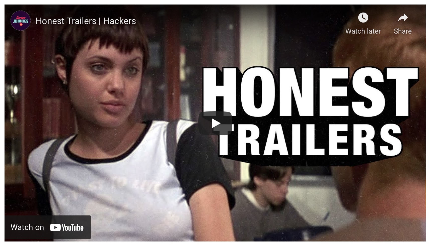 "Watch a film where everyone dresses like a Spice Girl fucked a RadioShack." The folks at Honest Trailers have fun skewering the hilariously dated Hackers (1995), starring Angelina Jolie in one her first filmic appearances.