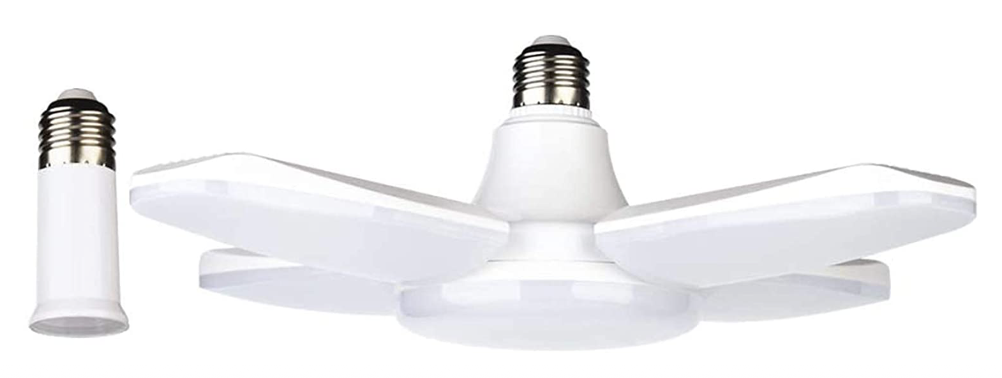 These LED lights are made for garages and basements. You can adjust the four blade-like panels to direct light where it's most needed. It screws into a regular socket (and comes with an extender adapter if you need it). I spend a lot of time in the garage, and these lights have made working in there much more pleasant and productive.
