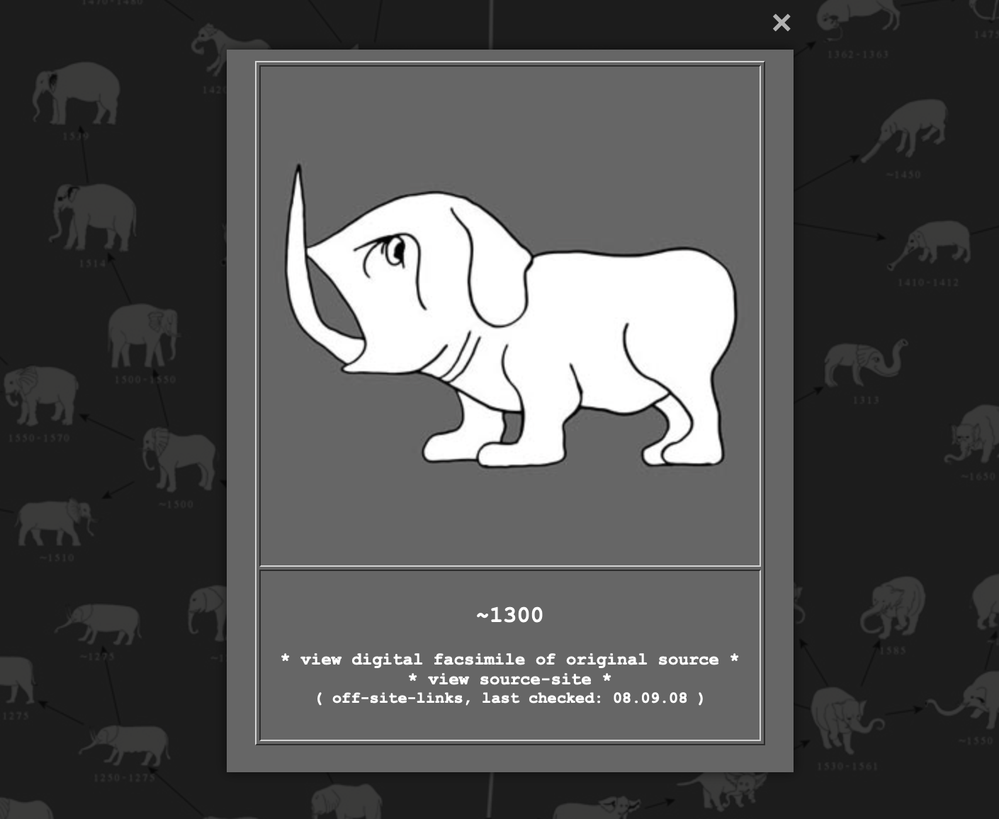 Since there was no real knowledge of how this animal actually looked, illustrators had to rely on oral and written transmissions to morphologically reconstruct the elephant, thus reinventing an actual existing creature. This tree diagram traces the evolution of the elephant depiction throughout the middle ages up to the age of enlightenment.