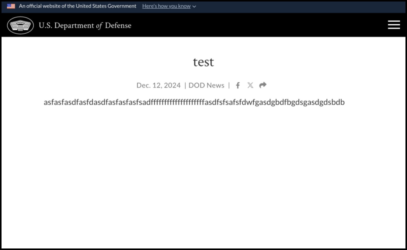 The U.S. Department of Defense conducted a test Thursday. The test was disclosed on the department's official website and was described by officials as asfasfasdfasfdasdfasfasfasfsadffffffffffffffffffffasdfsfsafsfdwfgasdgbdfbgdsgasdgdsbdb.