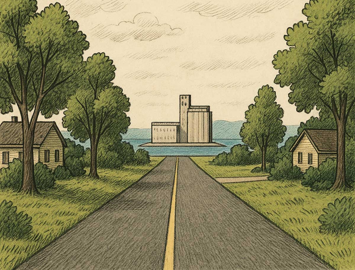 Atlas Obscura explains: "As you drive along the lakeshore heading east towards the town of Port Colborne, there's a federal grain elevator mill in the distance, which appears quite large, framed by a group of trees and the road ahead. However, as the trees become closer, the mill recedes rapidly into the distance."