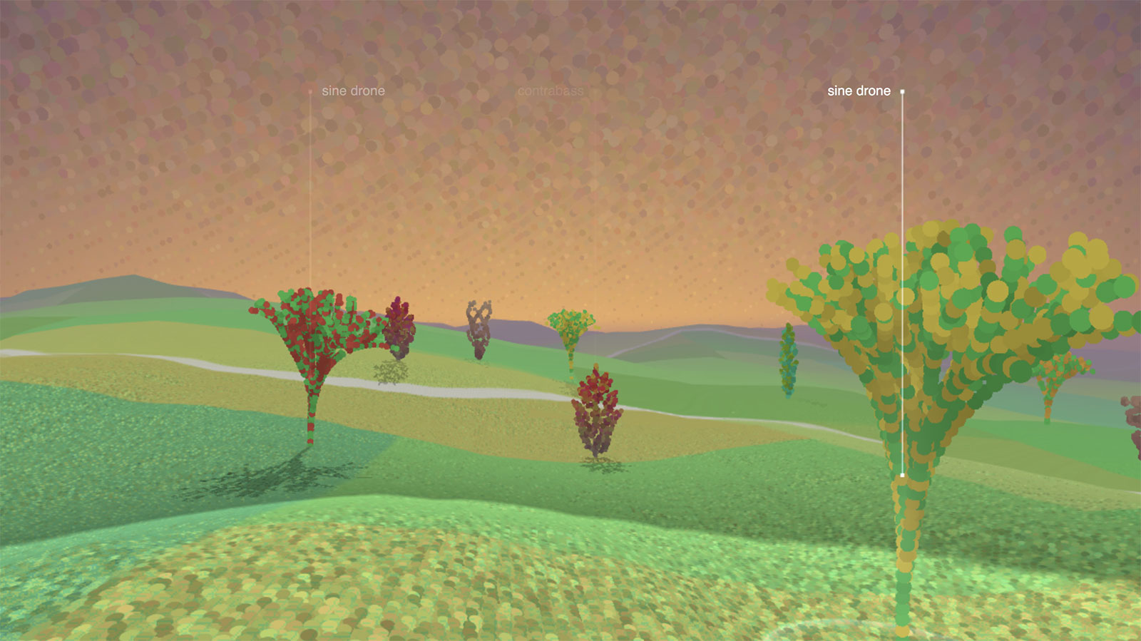 ambient.garden is an experiment that started with the question: can a composition be organized in space rather than time? Can it be experienced in space by the listener? To explore this concept, all the sounds and graphics were entirely generated from open source code. The sounds of ambient.garden were assembled and grown into a music album, A Walk Through the Ambient Garden, also open source.