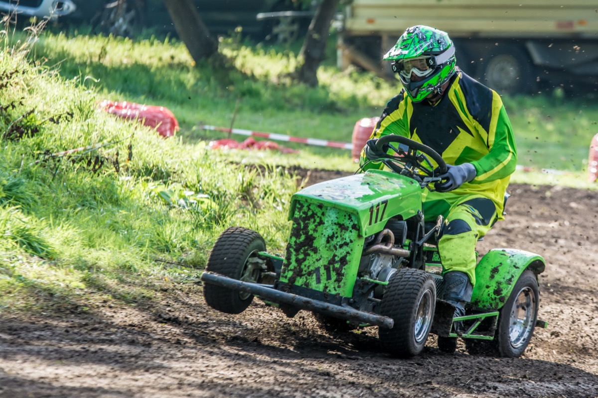 Lawn mower racers can hit speeds up to 50 mph as they zip around dirt tracks (without blades).
