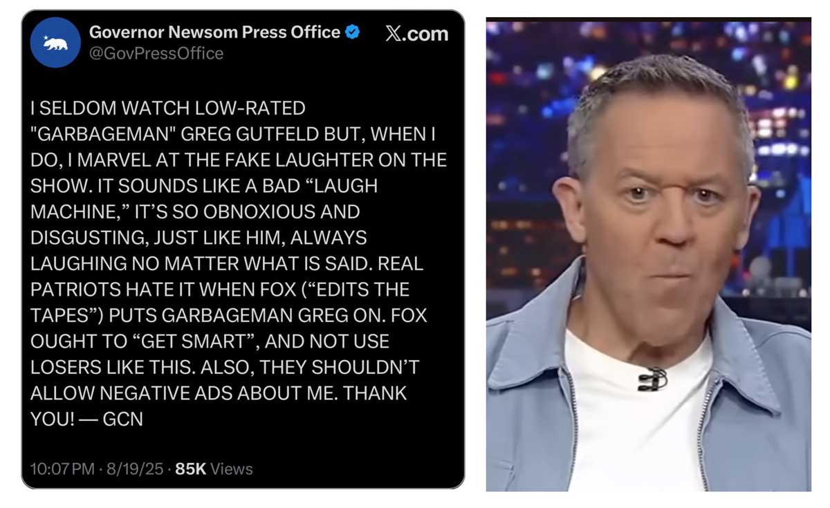 Newsom called Gutfeld "GARBAGEMAN GREG" while mimicking Trump's ALL-CAPS style: