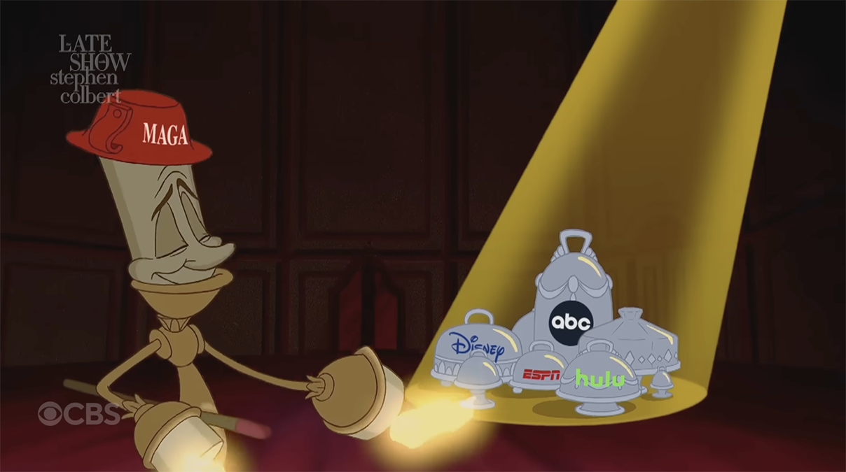 Last night, Stephen Colbert's "Late Show" aired a funny animated musical short featuring Lumière from Disney's own "Beauty and the Beast," singing "Shut Your Trap" to the tune of "Be Our Guest."