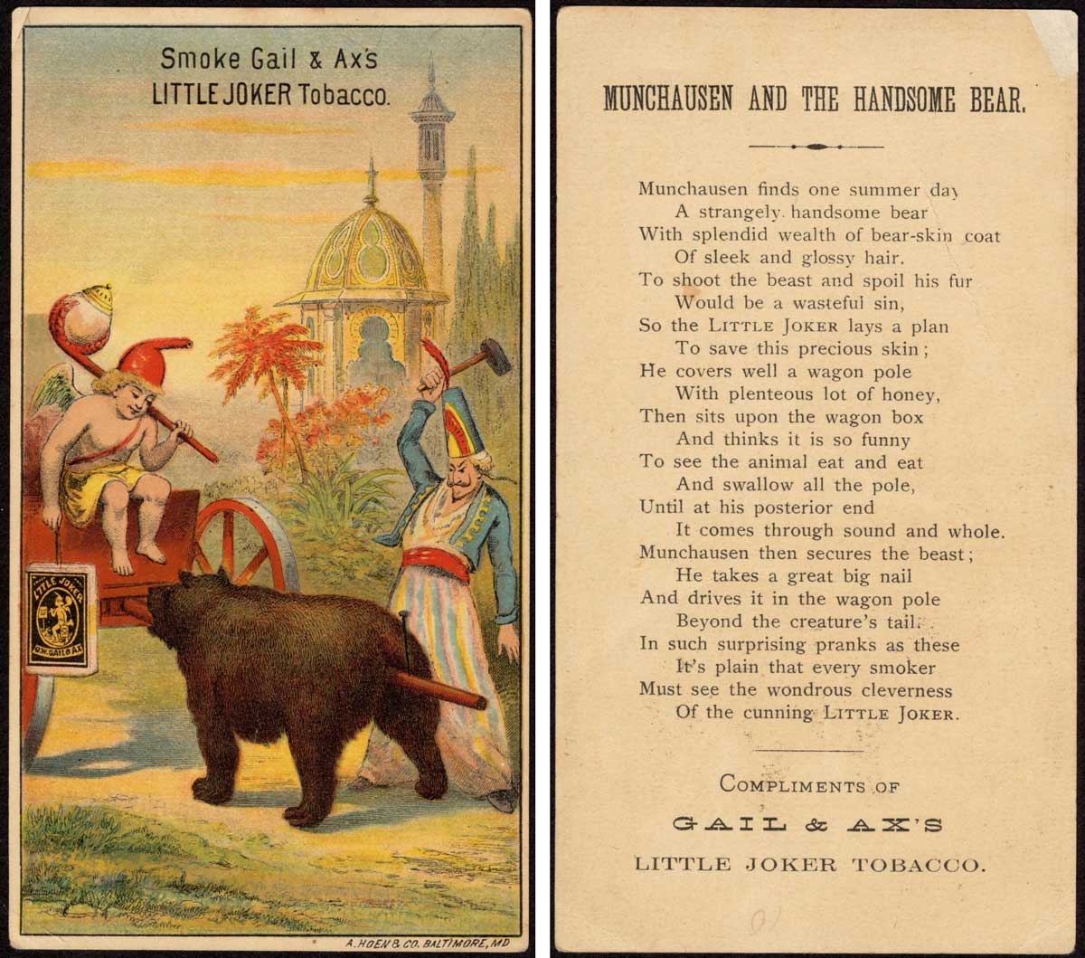 Around 1900, Little Joker tobacco launched an advertising campaign built on the outrageous adventures of Baron Munchausen, the fictional German braggart whose impossible exploits had captivated readers since 1785.