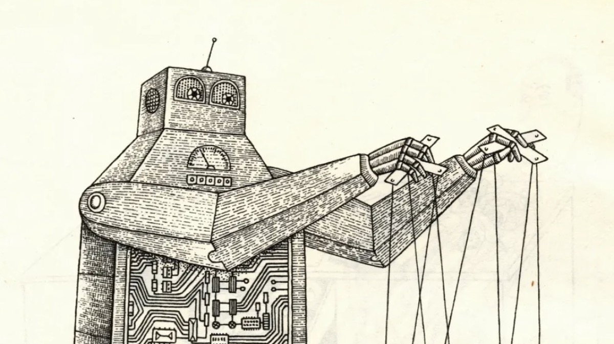In this 1987 cartoon by Bulgarian artist Milen Radev, an engineer operates a wireless remote control to command a towering robot— but the robot's mechanical hands grip puppet strings attached directly to the engineer himself. Who's really in control?